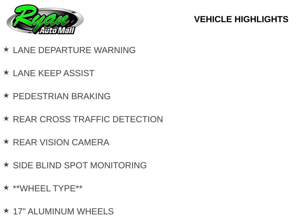 Safety and driver assistance features include automatic emergency braking, forward collision alert, lane keep assist, lane departure warning, blind spot monitoring, rear cross traffic detection, and a rear vision camera, helping provide peace of mind on every drive.
