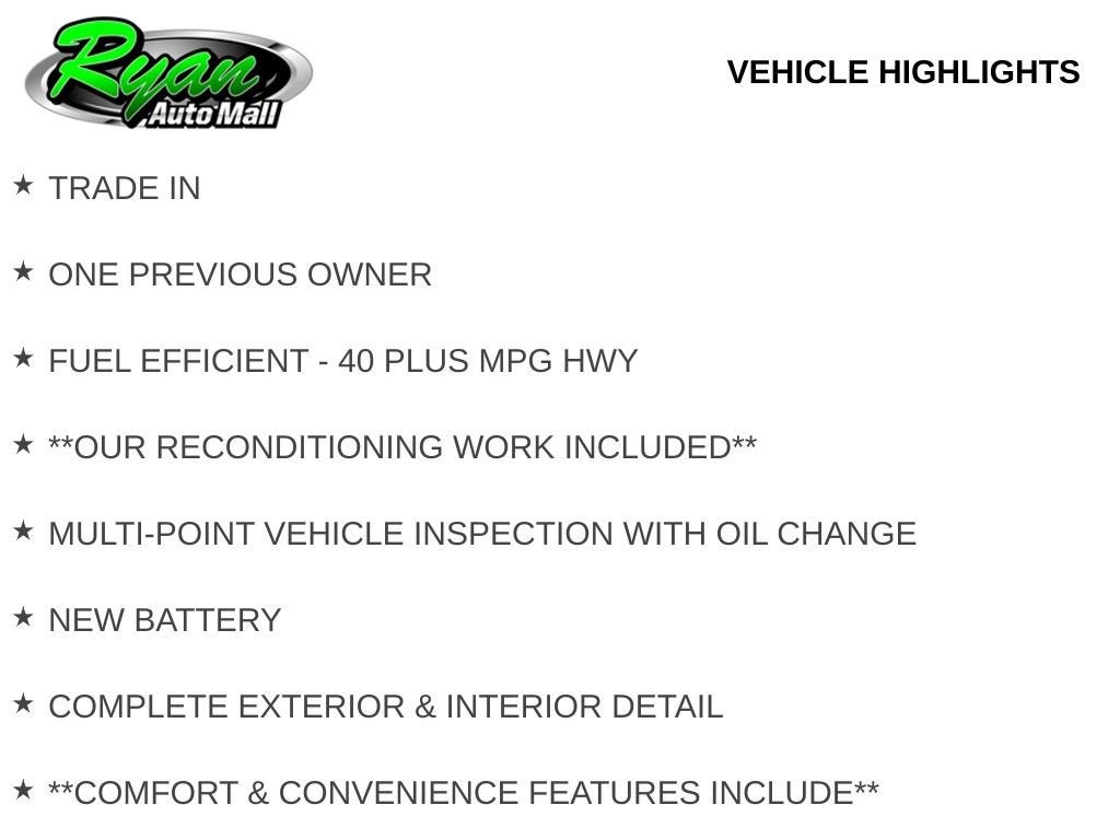 Our reconditioning work included a comprehensive multi-point inspection with oil change, a new battery, and a complete interior and exterior detail to ensure this vehicle meets the high standards expected at Ryan Chevrolet in Buffalo, MN. It rides on durable 15-inch steel wheels, adding to its long-term reliability.
