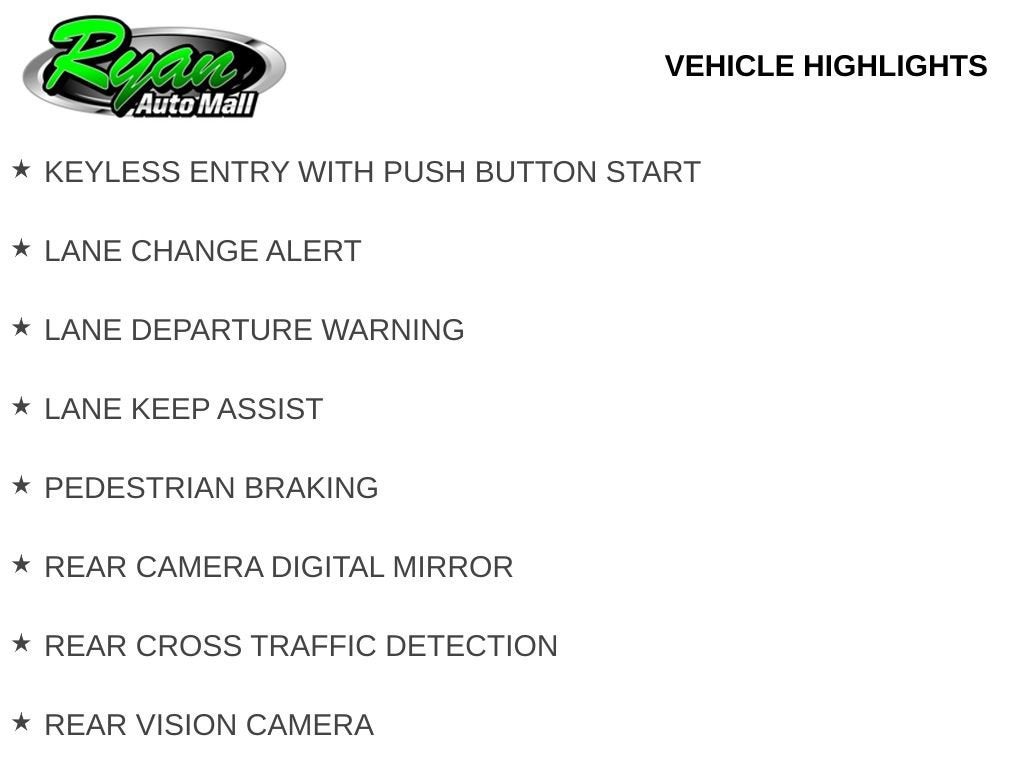 Technology is seamlessly integrated with an 8-inch touchscreen display, wireless Apple CarPlay and Android Auto connectivity, and wireless device charging, keeping you connected on the go. Safety features include automatic emergency braking, forward collision alert, lane keep assist, lane departure warning, blind spot monitoring, rear cross traffic detection, surround vision, and a rear camera digital mirror, helping provide confidence behind the wheel.