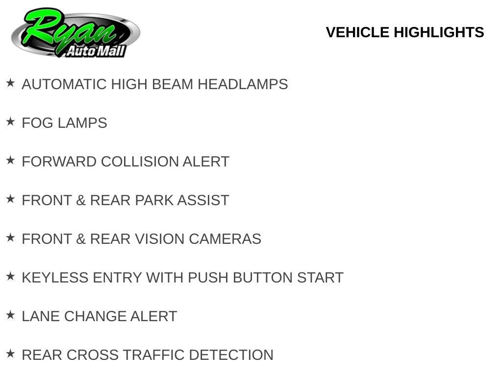 Safety and driver assistance features include forward collision alert, blind spot monitoring, rear cross traffic detection, front and rear park assist, multiple camera views, automatic high beam headlamps, and keyless entry with push-button start, delivering added confidence in all driving conditions.