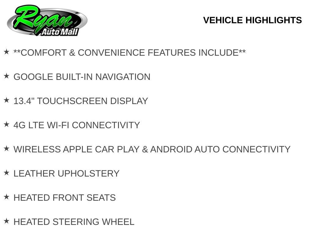 Inside the cabin, the Sierra SLT blends upscale materials with modern technology. Leather upholstery, heated front seats, heated steering wheel, bucket seats, power driver and passenger seats and memory settings create a welcoming environment for everyday driving or long trips. A multi-zone automatic climate control system, 120-volt interior power outlet and remote start add year-round convenience for Minnesota drivers. At the center of the dashboard sits a 13.4-inch touchscreen display featuring Google built-in navigation, wireless Apple CarPlay and Android Auto connectivity, and 4G LTE Wi-Fi that keeps you connected wherever the road leads. Standard equipment also includes keyless entry with push-button start, deep-tinted glass, fog lamps and tow hooks, along with 18-inch 6-spoke machined aluminum wheels that enhance both style and capability.